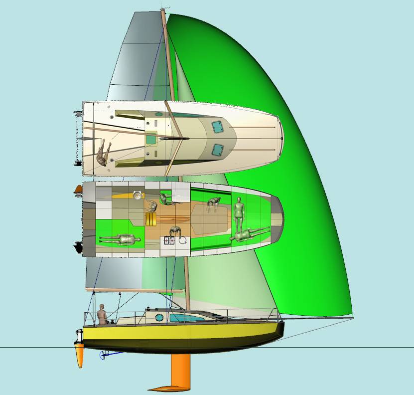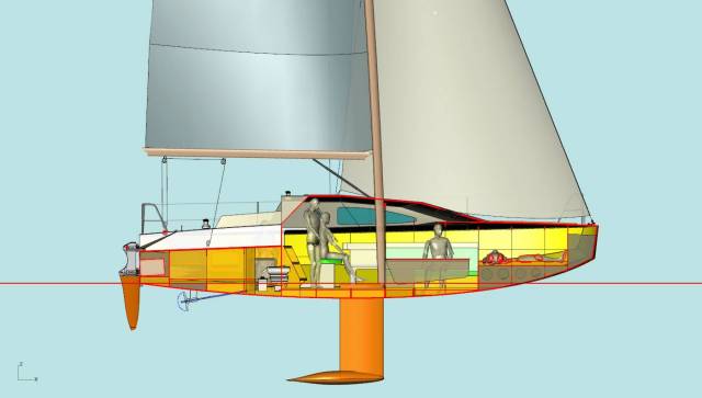 Il ne participera pas aux régates du circuit Classe IMER, mais s’adresse aux amateurs de sensations fortes en mer qui ne veulent pas se priver d’un volume habitable XXL à l’escale.